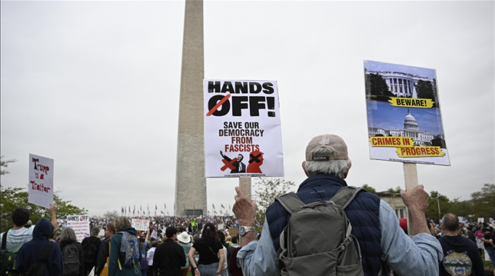 Puluhan ribu pengunjuk rasa menentang Trump dan Musk dalam aksi protes Hands Off di seantero AS pada Sabtu, 5 April 2025. (Anadolu Agency)