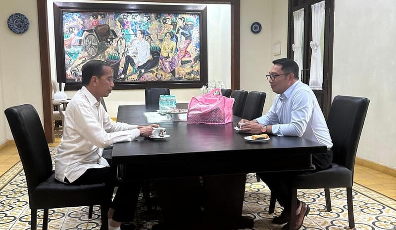 Mengenakan kemeja biru langit dengan tekstur katun ringan, Kang Emil, panggilan akrab calon gubernur Jakarta nomor urut 1, diterima di kediaman pribadi Jokowi Sekeliling pukul 14.30 WIB.