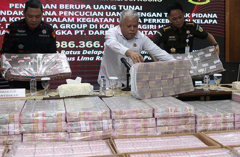 Kapuspenkum Kejagung Harli Siregar (tengah) menunjukkan barang bukti terkait kasus tindak pidana korupsi dan pencucian Fulus di Kejaksaan Akbar, Jakarta, Selasa (12/11/2024). Kejaksaan Akbar melalui Direktorat Penyidikan Jaksa Akbar Muda Tindak Pidana Spesifik (Jampidsus) menyita aset senilai Rp301,9 miliar yang terkait dengan kasus tindak pidana korupsi dan pencucian Fulus yang melibatkan PT Duta Palma Group. ANTARA/Reno Esnir/gus