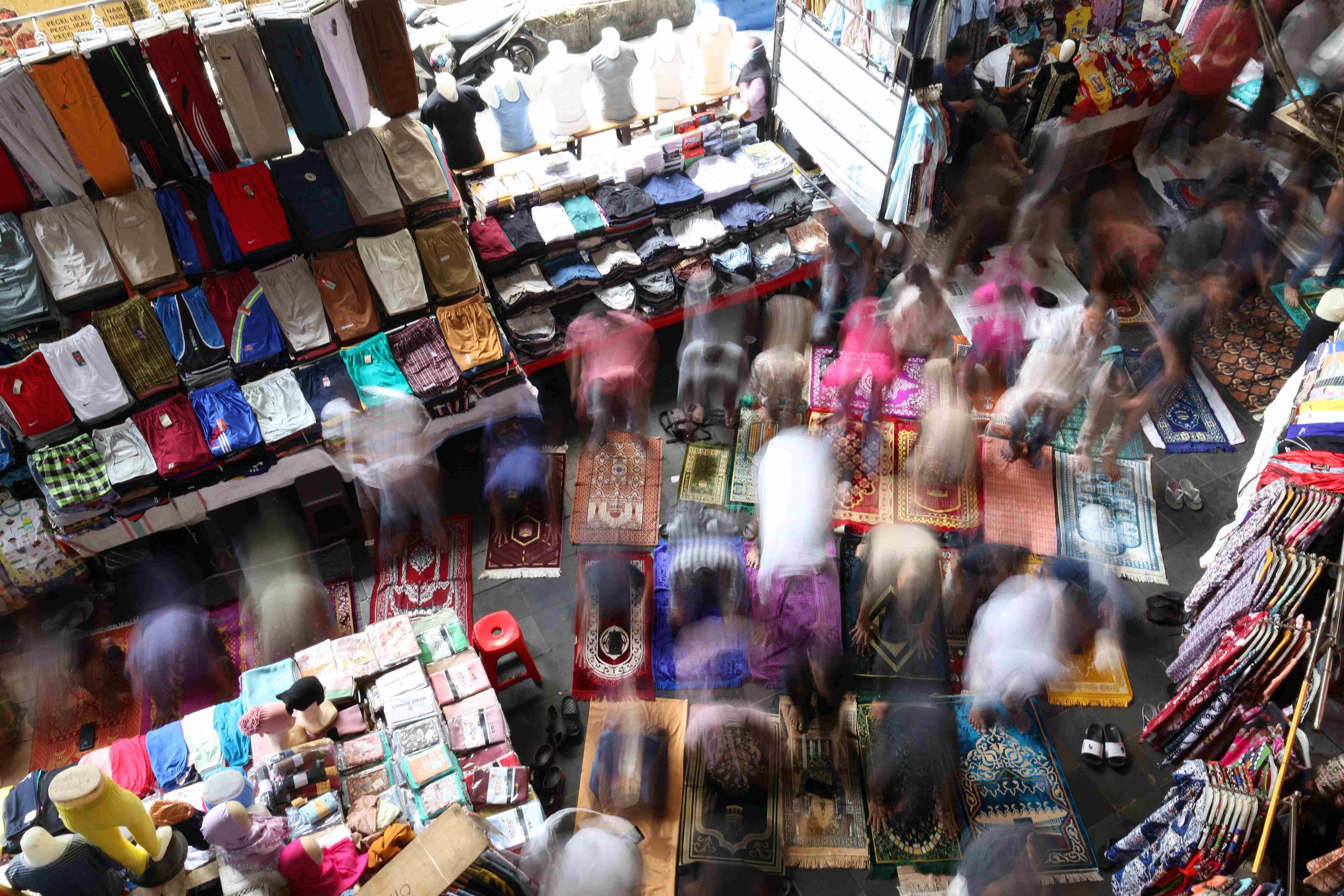 Jemaah menunaikan ibadah salat Jumat perdana pada Ramadan 1446H di selasar Pasar Tanah Abang, Jakarta, Jumat (7/3/2025). Salat Jumat tersebut diikuti oleh para pedagang dan pembeli pasar Tanah Abang. Nyaris setiap lorong di pasar Tanah Abang berubah menjadi area saf Demi Penyelenggaraan salat Jumat. Aktivitas perdagangan pun dihentikan sejenak. MI/Susanto/Ppj