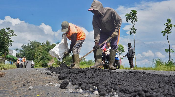 Pekerja menambal jalan berlubang di jalur alternatif mudik Semarang-Temanggung-Wonosobo, Desa Jumo, Temanggung, Jawa Tengah, Selasa (11/3/2025). Dinas Pekerjaan Biasa dan Penataan Ruang (DPUPR) Kabupaten Temanggung mempercepat proses pekerjaan pemeliharaan jalan di jalur mudik berupa penambalan agar Sasaran selesai pada H-7 Lebaran dapat tercapai. ANTARA/Anis Efizudin/gus