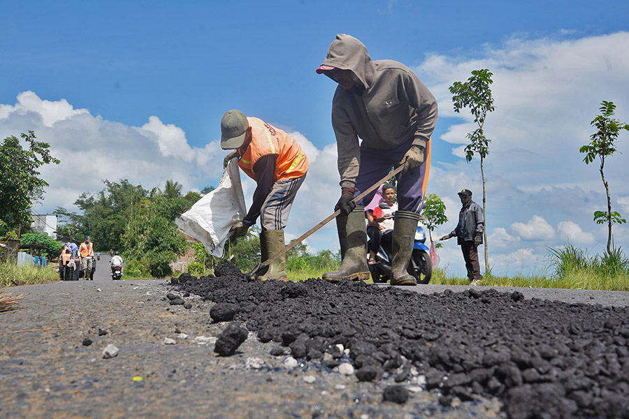 Pekerja menambal jalan berlubang di jalur alternatif mudik Semarang-Temanggung-Wonosobo, Desa Jumo, Temanggung, Jawa Tengah, Selasa (11/3/2025). Dinas Pekerjaan Biasa dan Penataan Ruang (DPUPR) Kabupaten Temanggung mempercepat proses pekerjaan pemeliharaan jalan di jalur mudik berupa penambalan agar Sasaran selesai pada H-7 Lebaran dapat tercapai. ANTARA/Anis Efizudin/gus