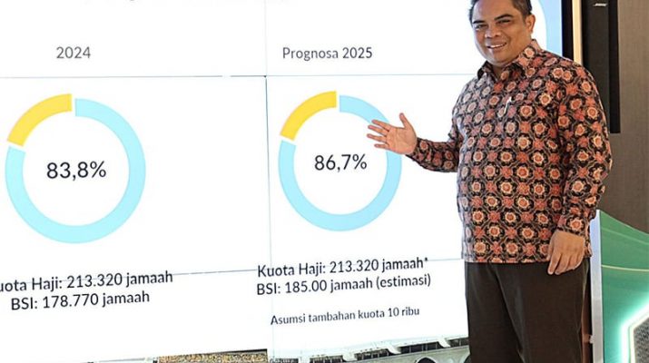 Direktur Sales & Distribution PT Bank Syariah Indonesia Tbk (BSI) Anton Sukarna memberikan paparan terkait persiapan Biaya Perjalanan Ibadah Haji (BPIH) di Kantor BSI The Tower, Gatot Subroto, Jakarta Selatan, (14/1/2025). BSI menargetkan Biaya tabungan haji pada 2025 Merukapan sebesar Rp20 triliun. Sementara pada 2024 Lewat, BSI mencatat Biaya tabungan haji sebanyak Rp14 triliun yang belum dipindahkan ke Badan Pengelola Keuangan Haji (BPKH). MI/Susanto/gus