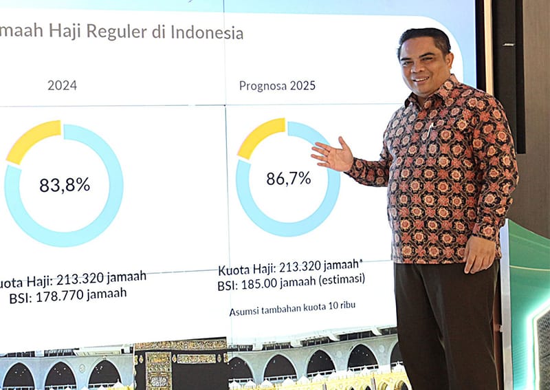 Direktur Sales & Distribution PT Bank Syariah Indonesia Tbk (BSI) Anton Sukarna memberikan paparan terkait persiapan Biaya Perjalanan Ibadah Haji (BPIH) di Kantor BSI The Tower, Gatot Subroto, Jakarta Selatan, (14/1/2025). BSI menargetkan Biaya tabungan haji pada 2025 Merukapan sebesar Rp20 triliun. Sementara pada 2024 Lewat, BSI mencatat Biaya tabungan haji sebanyak Rp14 triliun yang belum dipindahkan ke Badan Pengelola Keuangan Haji (BPKH). MI/Susanto/gus