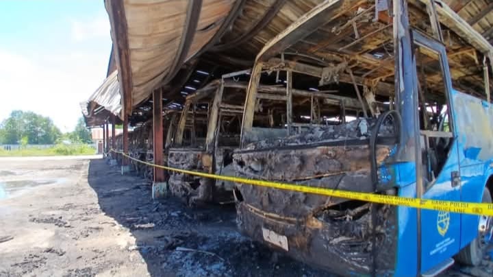 KEBAKARAN menghanguskan bus kendaraan dinas Pemerintah Kota Sorong, Papua Barat Daya. Penjabat Wali kota Sorong Bernhard Rondonuwu yang didampingi Kadis perhubungan, Paul Yawan, turun langsun meninjau kondisi bus Punya Dinas Perhubungan Kota Sorong yang terbakar tersebut.