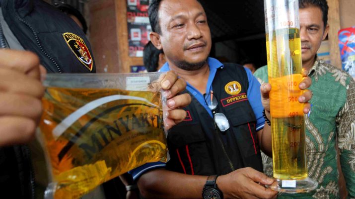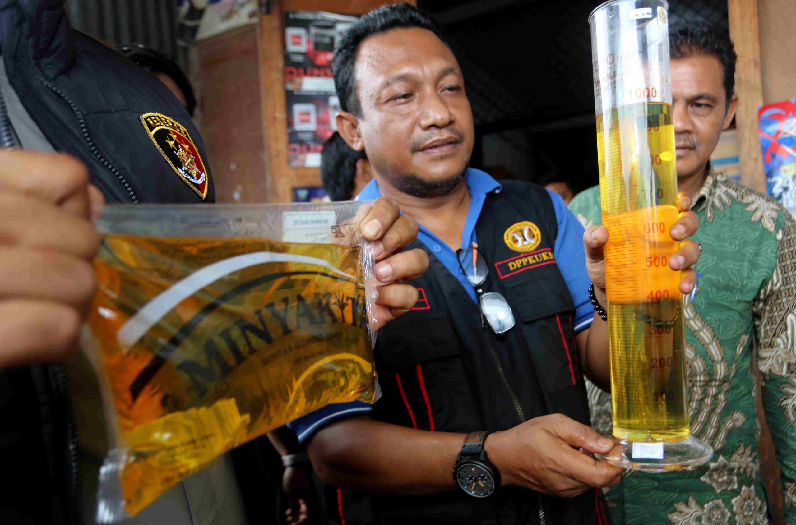 Tim Satgas pangan Satreskrim Polres Aceh Barat Serempak petugas Dinas Perdagangan, Perindustrian, Koperasi dan UKM (Disperindagkop) Kabupaten Aceh Barat menakar ulang minyak goreng merek Minyakita Ketika sidak di Pasar Bina Usaha Meulaboh, Aceh Barat, Aceh, Kamis (13/3/2025). Kegiatan tersebut Kepada memastikan isi minyak goreng tersebut sesuai dengan Ukuran sekaligus Kepada mengantisipasi pedagang Bengal yang menjual harga minyak di atas harga eceran tertinggi (HET) yang telah ditetapkan pemerintah. ANTARA FOTO/Syifa Yulinnas/Ppj