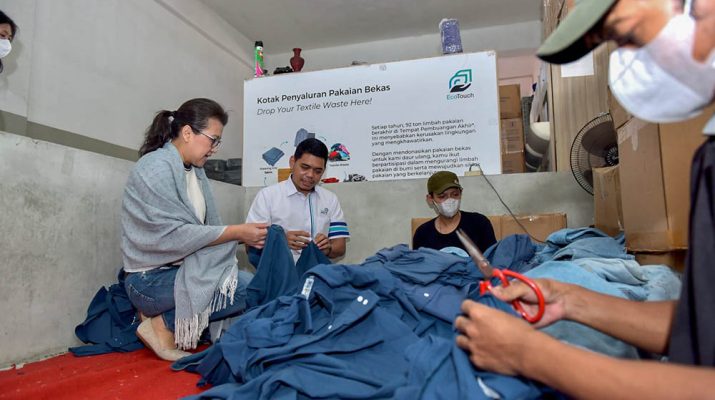 Manager Environment and Social Responsibility Asuransi Astra, Abdullah Kholifah (kiri) didampingi Co-Founder Eco Touch, Heidi (kedua kiri) mengamati seragam Pelan Asuransi Astra yang telah didaur ulang menjadi berbagai barang yang Mempunyai nilai tinggi di Pabrik Eco Touch, Jakarta Barat, Selasa (18/03/2025). Dalam rangka memperingati Hari Siklus Ulang Sedunia sebanyak 2.97 ton seragam Pelan Asuransi Astra didaur ulang menjadi barang dengan nilai baru. MI/Usman Iskandar