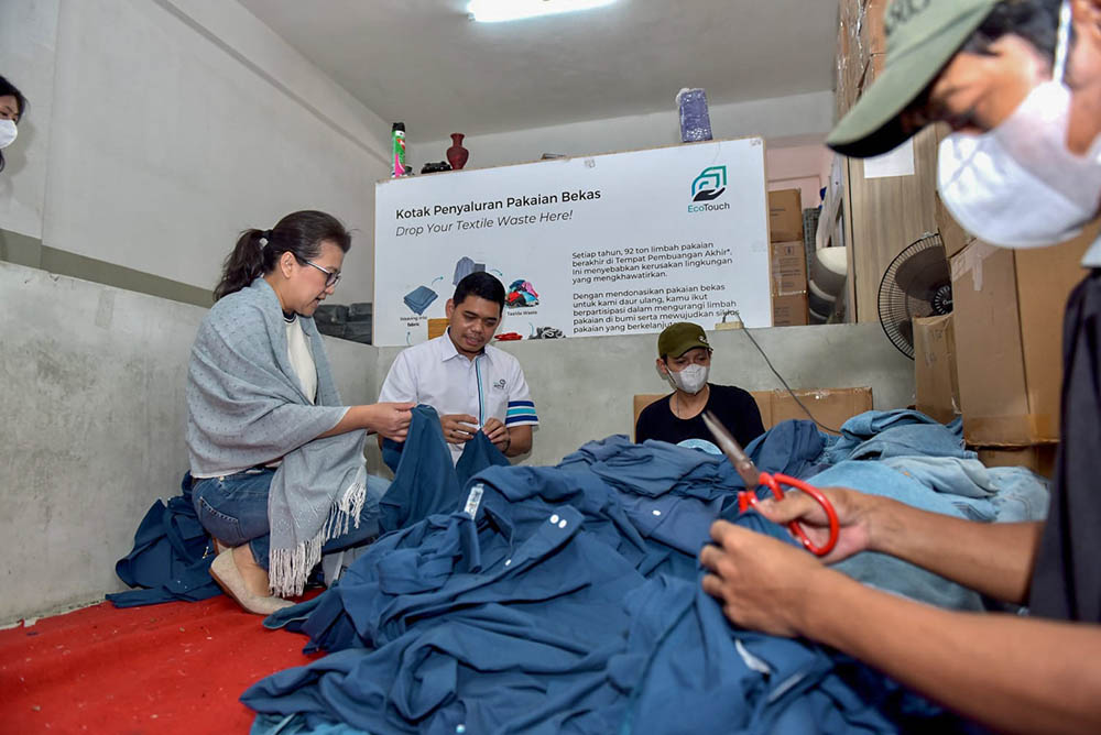 Manager Environment and Social Responsibility Asuransi Astra, Abdullah Kholifah (kiri) didampingi Co-Founder Eco Touch, Heidi (kedua kiri) mengamati seragam Pelan Asuransi Astra yang telah didaur ulang menjadi berbagai barang yang Mempunyai nilai tinggi di Pabrik Eco Touch, Jakarta Barat, Selasa (18/03/2025). Dalam rangka memperingati Hari Siklus Ulang Sedunia sebanyak 2.97 ton seragam Pelan Asuransi Astra didaur ulang menjadi barang dengan nilai baru. MI/Usman Iskandar
