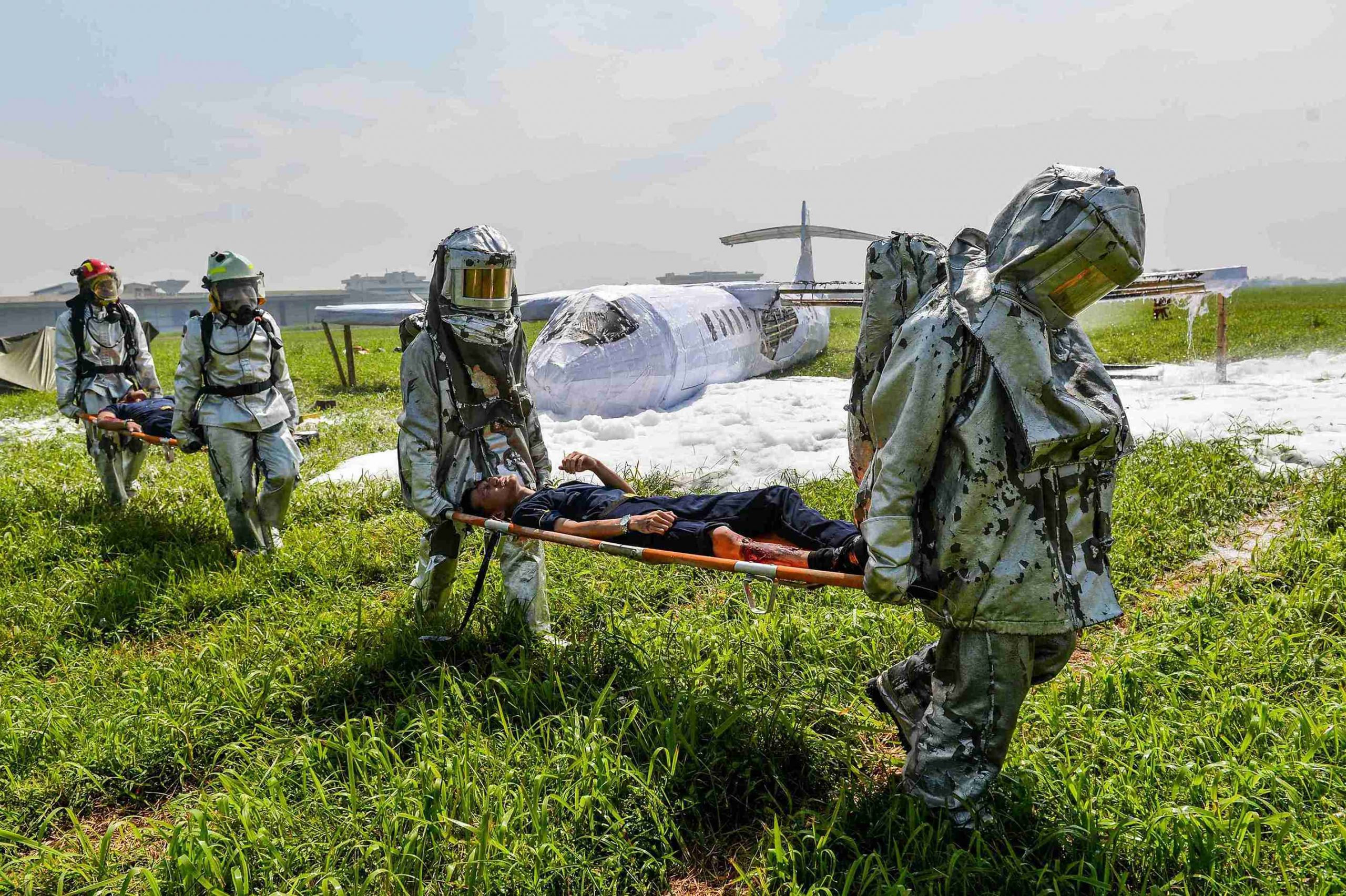 Petugas mengevakuasi korban kecelakaan pesawat Demi simulasi keadaan darurat di Bandara Husein Sastranegara, Bandung, Jawa Barat, Rabu (24/9/2025). PT Angkasa Pura II Serempak Lanud Husein Sastranegara menggelar simulasi keadaan darurat yang ditujukan Demi menguji Mekanisme penanganan keadaan darurat sekaligus memperkuat koordinasi antara pihak bandara, TNI AU, Basarnas, aparat keamanan, tenaga medis, dan instansi terkait lainnya. ANTARA FOTO/Raisan Al Farisi/Ppj