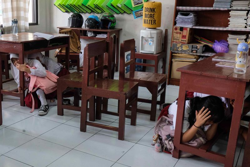Sejumlah siswa mengikuti simulasi gempa bumi dan kebakaran pada gladi lapang mitigasi kesiapsiagaan bencana alam di Sekolah Dasar Negeri Kleco Solo, Jawa Tengah, Kamis (22/8/2024). Simulasi yang melibatkan BPBD Solo, PMI, Pemadam Kebakaran, Polisi dan relawan tersebut sebagai upaya menyiapkan langkah antisipasi dan penanganan bencana alam gempa bumi, kebakaran, serta kekeringan agar warga lebih waspada. ANTARAFOTO/Maulana Surya/Per