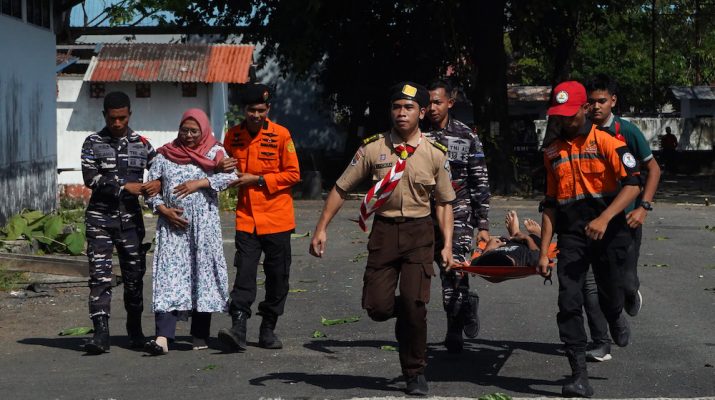 Tim gabungan dari TNI AL, TNI AD, BPBD dan Basarnas mengevakuasi korban banjir Demi simulasi penanganan bencana di Markas Komando Lantamala VI Makassar, Sulawesi Selatan, Kamis (19/6/2025). Simulasi tersebut sebagai bentuk kesiapsiagaan dan kordinasi tim gabungan dalam mengantisipasi apabila terjadi bencana khususnya banjir yang kerap melanda Area Kota Makassar. ANTARA FOTO/Hasrul Said/sas