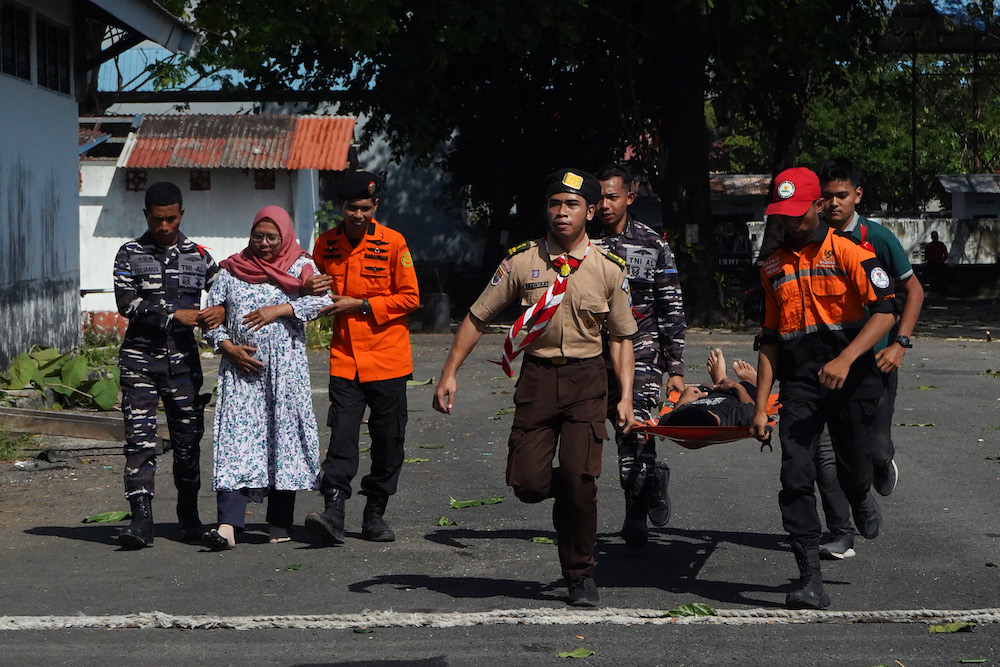 Tim gabungan dari TNI AL, TNI AD, BPBD dan Basarnas mengevakuasi korban banjir Demi simulasi penanganan bencana di Markas Komando Lantamala VI Makassar, Sulawesi Selatan, Kamis (19/6/2025). Simulasi tersebut sebagai bentuk kesiapsiagaan dan kordinasi tim gabungan dalam mengantisipasi apabila terjadi bencana khususnya banjir yang kerap melanda Area Kota Makassar. ANTARA FOTO/Hasrul Said/sas