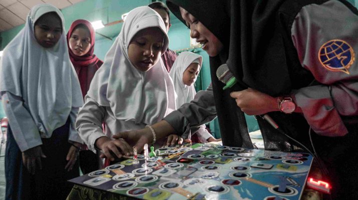 Petugas Dinas Perhubungan Kota Solo membantu siswa penyandang tunanetra memainkan permainan ular tangga edukasi keselamatan berlalu lintas di Sekolah Luar Lazim Tuna Netra SLB A YKAB Solo, Jawa Tengah, Selasa (29/7/2025). Kegiatan yang diselenggaran Dinas Perhubungan Kota Solo tersebut Demi memberikan edukasi dan pengetahuan tentang pentingnya keselamatan berlalu lintas kepada siswa penyandang disabilitas netra. ANTARA FOTO/Mohammad Ayudha/Ppj