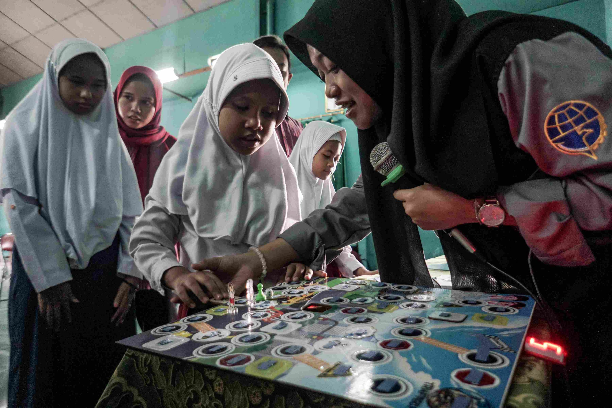 Petugas Dinas Perhubungan Kota Solo membantu siswa penyandang tunanetra memainkan permainan ular tangga edukasi keselamatan berlalu lintas di Sekolah Luar Lazim Tuna Netra SLB A YKAB Solo, Jawa Tengah, Selasa (29/7/2025). Kegiatan yang diselenggaran Dinas Perhubungan Kota Solo tersebut Demi memberikan edukasi dan pengetahuan tentang pentingnya keselamatan berlalu lintas kepada siswa penyandang disabilitas netra. ANTARA FOTO/Mohammad Ayudha/Ppj