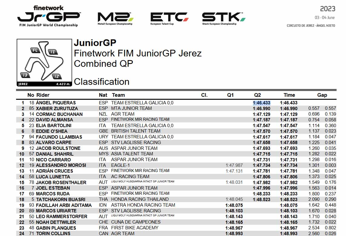 liputanindo.com – Dua Pembalap Muda Spanyol ; Angel Piqueras berhasil menorehkan Laptime tercepat pada sesi Kualifikasi kedua dengan 1:46.433 diikuti Xabier Zurutuza dan Cormax Buchanan dari Selandia Baru pada kombinasi dua kali Kualifikasi JuniorGP Junior World Championship Jerez 2023.