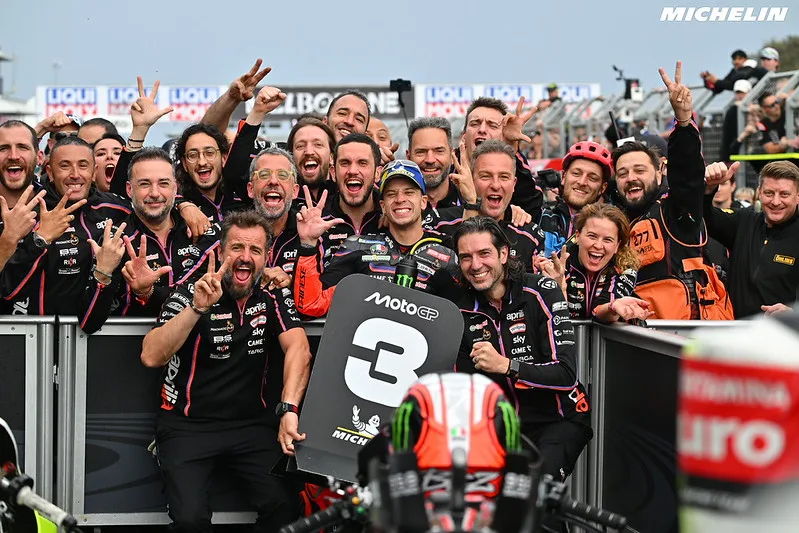 Dua pembalap Aprilia naik podium MotoGP Demi pertama kalinya Tengah sejak terakhir terjadi di GP Catalan di Barcelona 2023, ketika mereka meraih posisi 1-2 lewat kemenangan Aleix Espargaro dan Maverick Viñales.