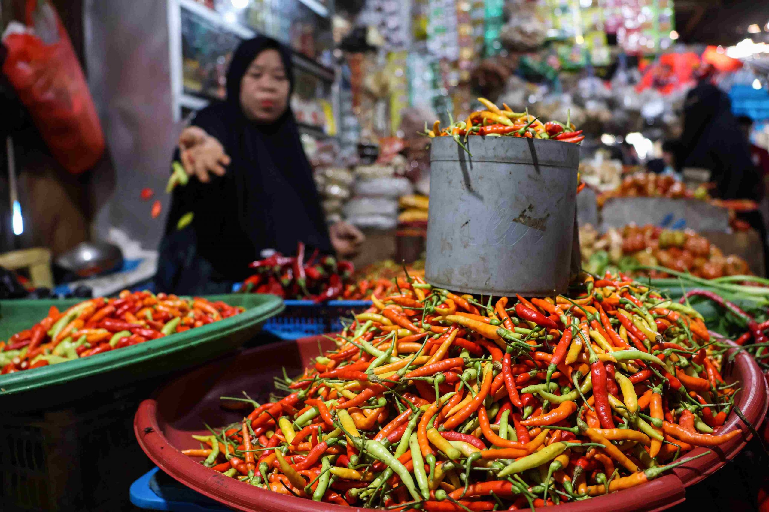 Penjual membersihkan cabai rawit yang dijual di Pasar Pabaeng-Baeng Makassar, Sulawesi Selatan, Rabu (4/6/2025). Badan Pusat Statistik (BPS) Sulawesi Selatan mecatat Provinsi Sulsel mengalami deflasi secara bulanan (month to month) pada Mei 2025 sebesar 0,34 persen dengan komoditas penyumbang Penting deflasi di daerah tersebut di antaranya cabai rawit dengan andil mencapai 0,14 persen. ANTARA FOTO/Arnas Padda/Ppj