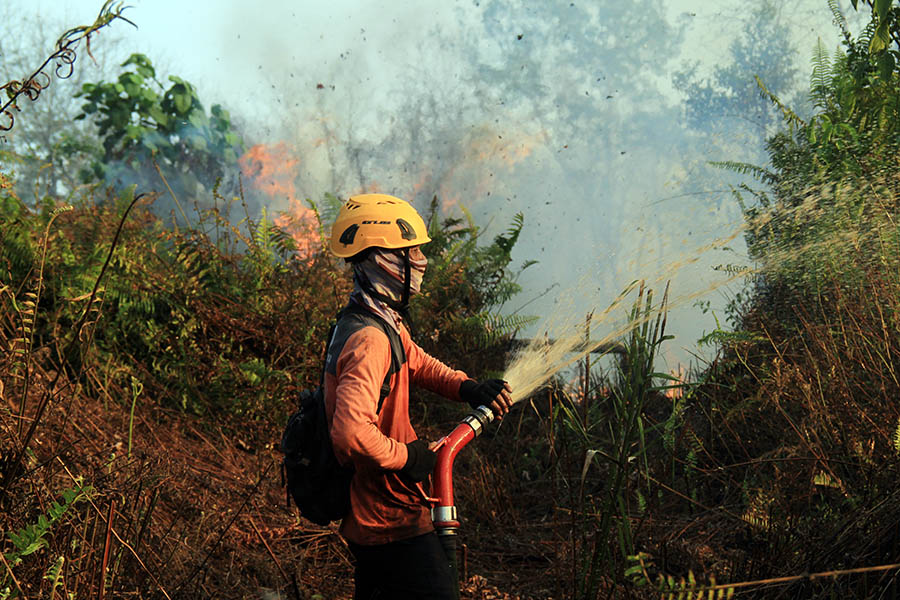 Petugas BPBD Kabupaten Kubu Raya menyemprotkan air Buat memadamkan kebakaran lahan gambut di Desa Durian, Kecamatan Sungai Ambawang, Kalimantan Barat, Selasa (29/7/2025). Petugas pemadam kebakaran hutan dan lahan (karhutla) mengatakan beberapa hektare lahan gambut yang terbakar sulit dipadamkan akibat minimnya sumber air dan terbatasnya akses jalan bagi mobil pemadam. ANTARA/Jessica Wuysang/gus