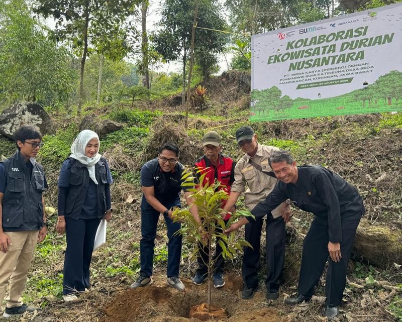 PT Indra Karya (Persero) menyerahkan bantuan bibit Durian Nusantara untuk petani di Desa Seda, Kecamatan Mandirancan, Kabupaten Kuningan, Jawa Barat.
