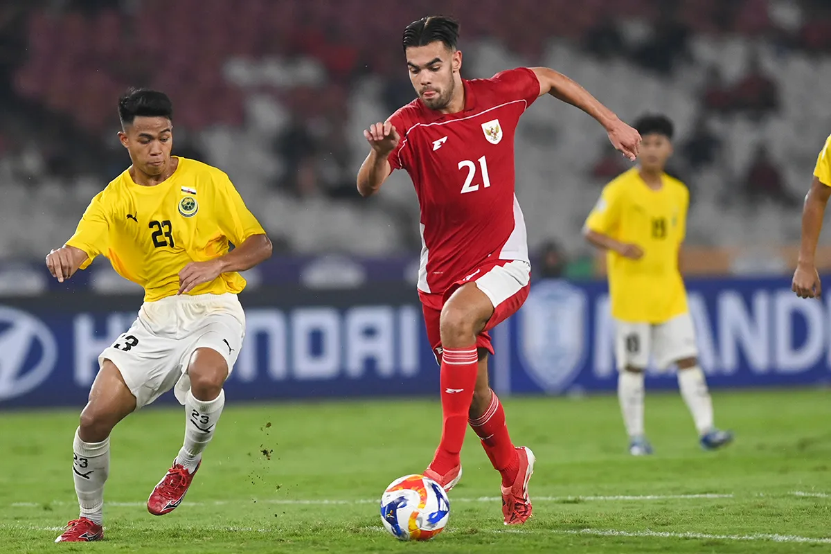 Liputanindo.id – Pesepak bola Timnas U23 Indonesia Jens Raven (kanan) melewati hadangan pesepak bola Timnas U23 Brunei Darussalam Mohammad Nazry Aiman Bin Azman (kiri) dalam pertandingan penyisihan Grup A Piala AFF U-23 2025 di Stadion Primer Gelora Bung Karno (SUGBK), Senayan, Jakarta, Selasa (15/7/2025). (Antara/Aditya Pradana Putra)