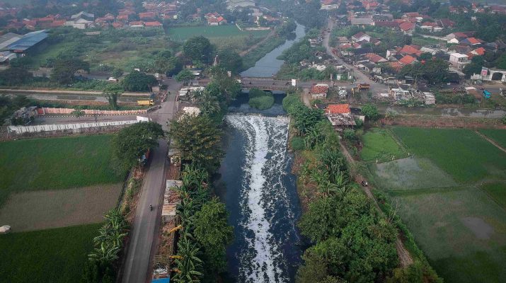 Foto udara Kategori Sungai Cirarab yang menghitam dan berbusa di Sukadiri, Kabupaten Tangerang, Banten, Rabu (14/5/2025). Penduduk setempat mengeluhkan kondisi Sungai Cirarab yang tercemar hingga menyebabkan air berubah Corak serta menimbulkan bau Tak sedap yang diduga akibat limbah industri dan berharap pemerintah dapat menanggulangi permasalahan tersebut guna menghindari potensi penyakit yang akan ditimbulkan. ANTARA FOTO/Putra M. Akbar/Ppj