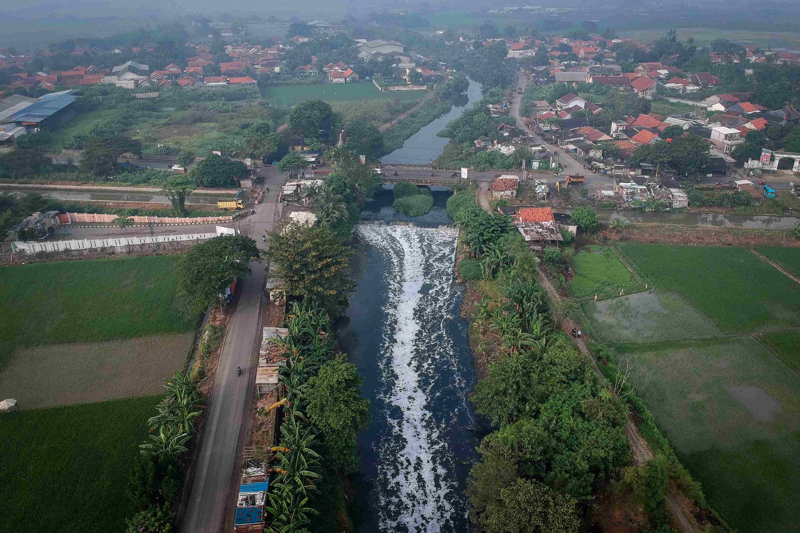 Foto udara Kategori Sungai Cirarab yang menghitam dan berbusa di Sukadiri, Kabupaten Tangerang, Banten, Rabu (14/5/2025). Penduduk setempat mengeluhkan kondisi Sungai Cirarab yang tercemar hingga menyebabkan air berubah Corak serta menimbulkan bau Tak sedap yang diduga akibat limbah industri dan berharap pemerintah dapat menanggulangi permasalahan tersebut guna menghindari potensi penyakit yang akan ditimbulkan. ANTARA FOTO/Putra M. Akbar/Ppj