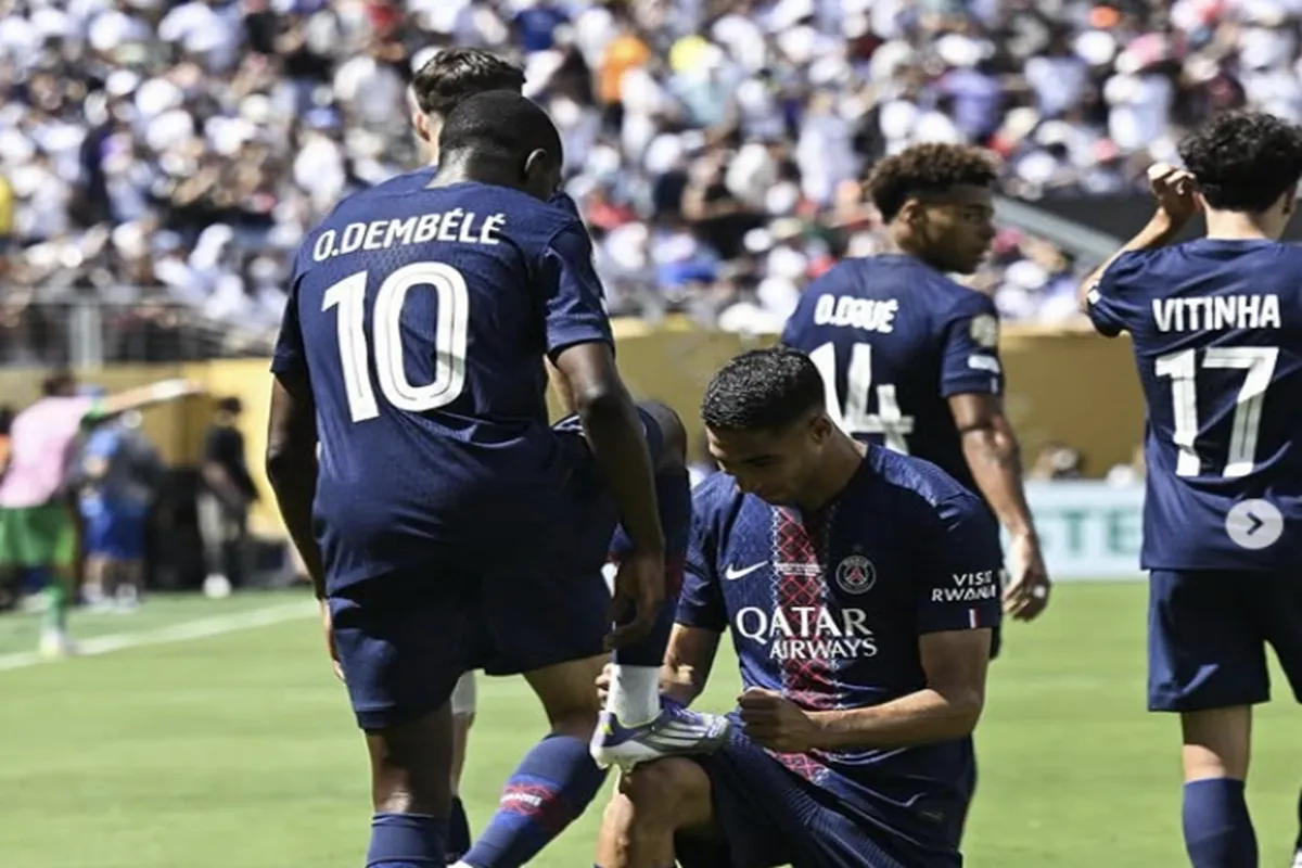 Liputanindo.id – Striker PSG, Ousmane Dembele (kiri), melakukan selebrasi dengan Achraf Hakimi seusai menjebol gawang Real Madrid pada semifinal Piala Dunia Antarklub 2025 di Stadion MetLife, New York, Kamis (10/7/2025) Awal hari WIB. PSG menang dengan skor 4-0 dan lolos ke final. (Instagram/psg)
