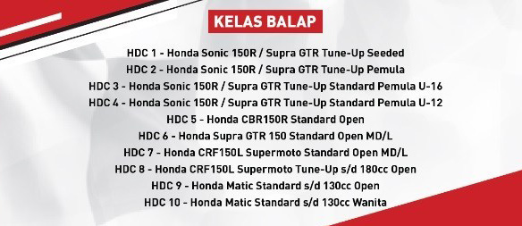 Dalam dua hari Penyelenggaraan HDC Purwokerto ini akan dipertandingkan 10 kelas HDC dimana Demi kelas Bebek dan sport di 5 kelas yang sudah Eksis sebelumnya yakni Honda Sonic 150R/Supra GTR Tune Up Seeded (HDC-1), Honda Sonic 150R/Supra GTR Tune Up Pemula (HDC- 2), Honda Sonic 150R/Supra GTR Standar Pemula U-16 (HDC-3), juga Honda Sonic 150R/Supra GTR Tune Up Standar Pemula U-12 (HDC-4). Selain itu, Tetap Eksis kelas Honda CBR150RR Standar Open (HDC-5).