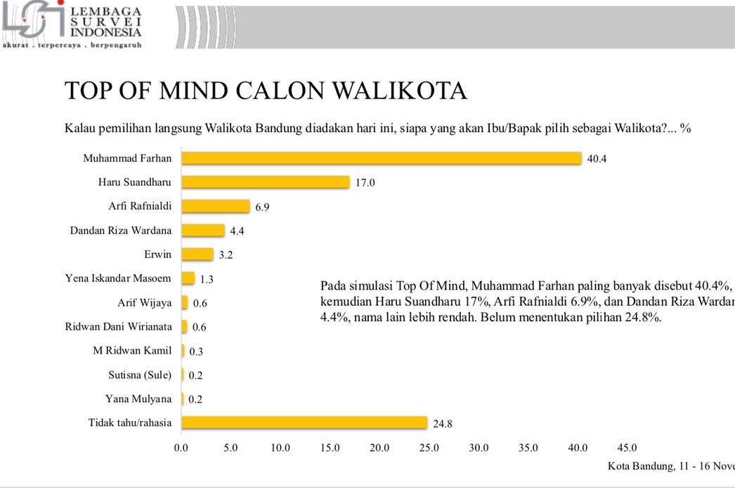 Kekasih calon (paslon) Wali Kota dan Wakil Wali Kota Bandung, Jawa Barat (Jabar), Muhammad Farhan dan Erwin Begitu ini unggul dari ketiga paslon lain yang juga mencalonkan diri dalam pemilihan kepala daerah (pilkada) Kota Bandung. Intervensi ini berdasarkan survei yang dilakukan oleh Lembaga Survei Indonesia (LSI) pada periode 11 – 16 November 2024.