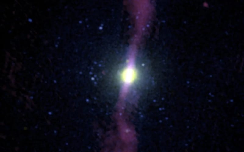 Penelitian mengungkapkan tabrakan antara galaksi cakram di awal alam semesta menghasilkan Aliran besar gas dingin yang memicu pembentukan galaksi raksasa berbentuk bulat.(Digitised Sky Survey/NASA Chandra/Very Large Array)