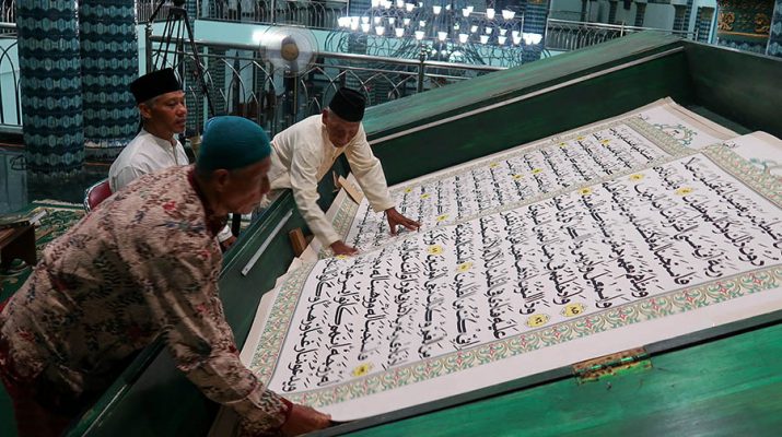 Petugas membalik lembaran Alquran raksasa di Masjid Akbar Baiturrahman, Banyuwangi, Jawa Timur, Rabu (5/3/2025). Tradisi tadarus Alquran raksasa berukuran 142 x 210 centimeter yang ditulis tangan oleh Abdul Karim pada tahun 2010 itu membutuhkan dua orang petugas Kepada membalikkan setiap lembar Alquran ketika mencapai halaman berikutnya. ANTARA/Budi Candra Setya/gus
