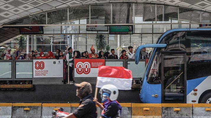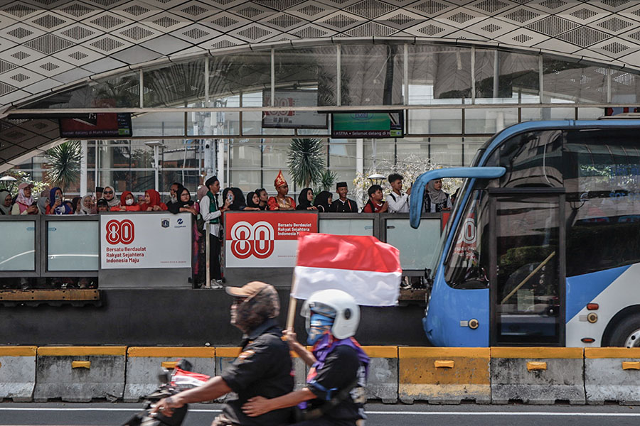 Penumpang bersiap menaiki bus Trans-Jakarta di Halte Bundaran HI, Jakarta, Minggu (17/8/2025). Pemprov DKI Jakarta menetapkan tarif Spesifik sebesar Rp80 Demi layanan angkutan Lumrah terintegrasi seperti MRT, LRT Jakarta, dan Trans-Jakarta dalam rangka HUT Ke-80 RI pada 17-18 Agustus 2025. ANTARA/M Rizky Febriansyah/gus