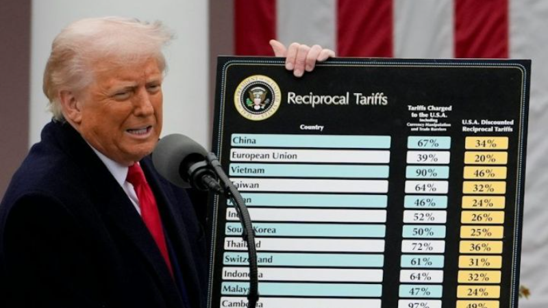 Donald Trump menunjukan daftar negara-negara dengan besar tarif yang dikenakan. (EPA-EFE/KENT NISHIMURA / POOL)