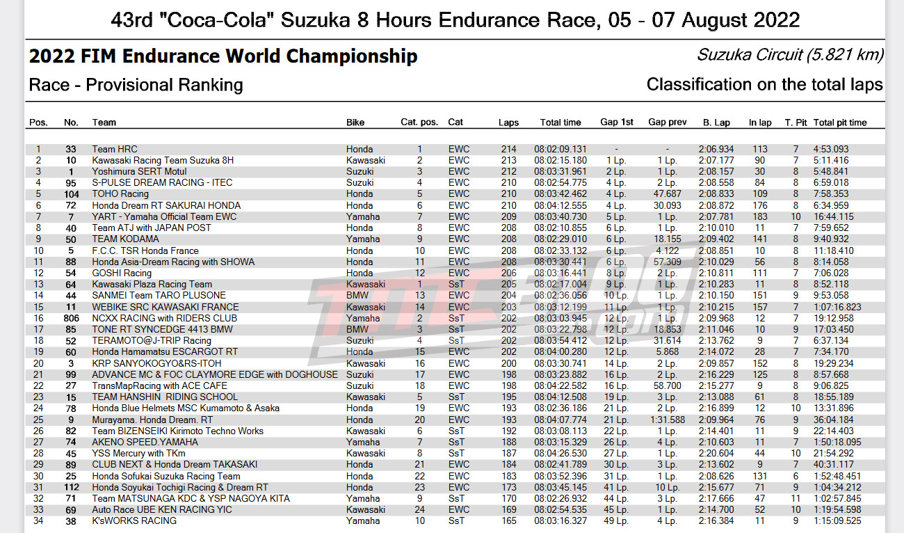 Dan akhirnnya setelah 8 jam HRC team yang tahun ini dibesut oleh Trisula Pembalap Iker Lecuona, Tetsuya Nagashima, dan Takumi Takahashi Keluar sebagai Juara Race endurance Suzuka 8H 2022. Kawasai Racing Team yang di perkuat Jonathan Rea, Alex Lowes dan Leon haslam hadir sebagai Juara dua.