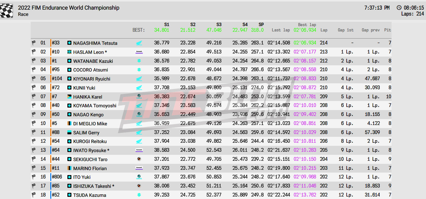 Hebatnya Berkualitas HRC team dan KRT sama sama hanya menggunakan jatah 7 Kali Pitstop artinya mereka rata rata ambil pitstop per-1 jam. Disusul Oleh Tim EWC Yoshimura Suzuki SERT Motul di Posisi tiga dengan 8 kali pitstop. Pembaap Indonesia Gerry Salim yang membalap di jam terakhir membawa Honda Dream Racing finish di Posisi 11
