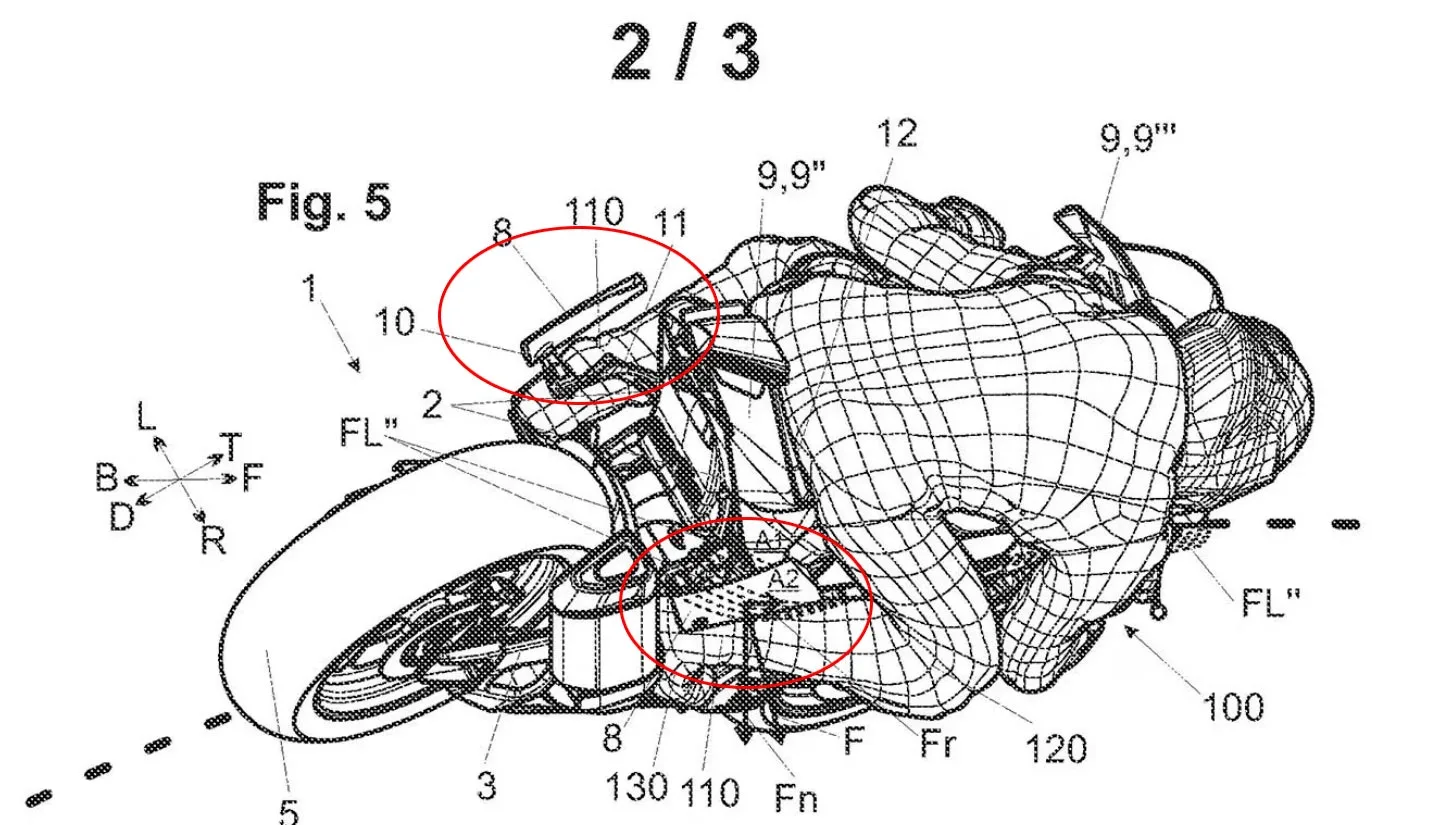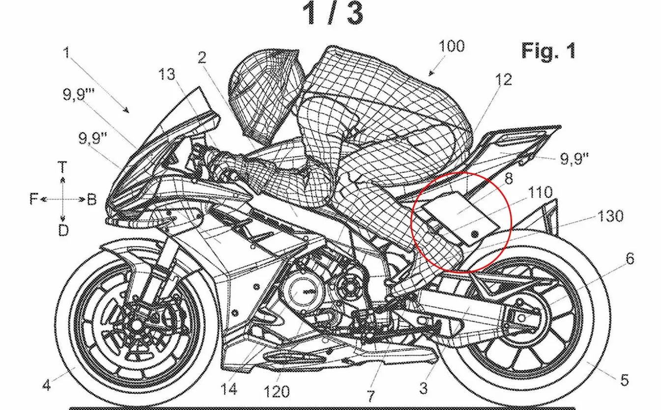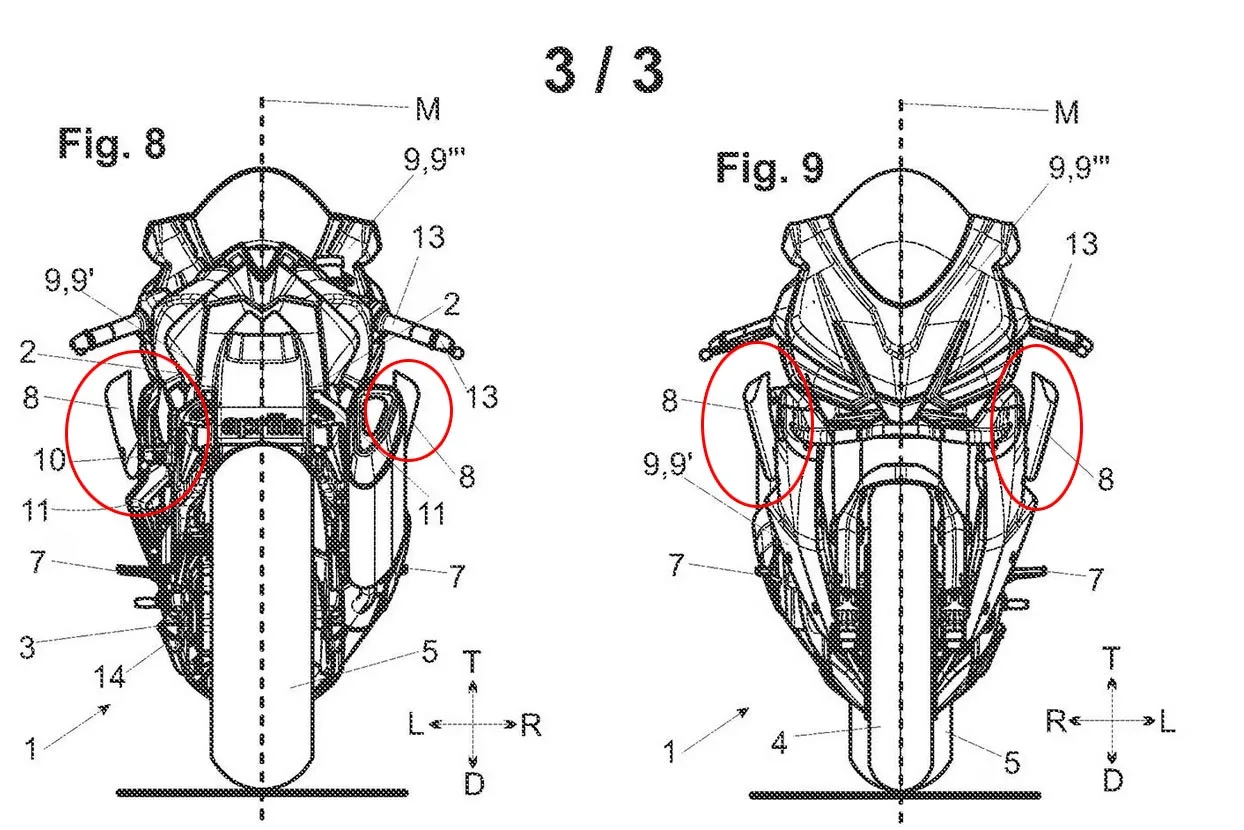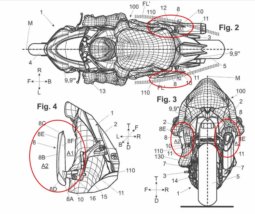 Kalau sobat Menyaksikan gambar patennya, leg wing ini berupa sirip tambahan yang diletakkan di sisi samping fairing tengah, Cocok di depan area kaki pengendara. Berbeda dengan winglet depan yang Konsentrasi mencari beban tekan (downforce) pada ban depan, paten ini Mempunyai tujuan ganda: Aerodinamika dan Thermal Management.
