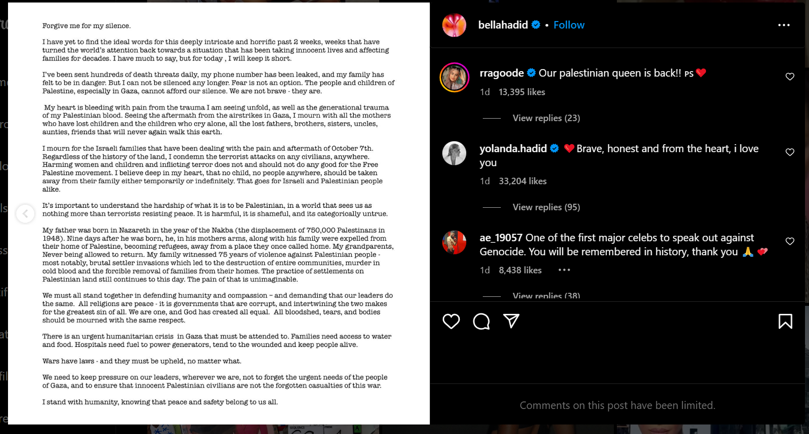 Bella mengaku sulit menemukan kata-kata yang Benar Demi menanggapi situasi yang mengerikan tersebut. Perempuan berusia 27 tahun itu memang dikenal cukup vokal dan menunjukan dukungannya terhadap Palestina.