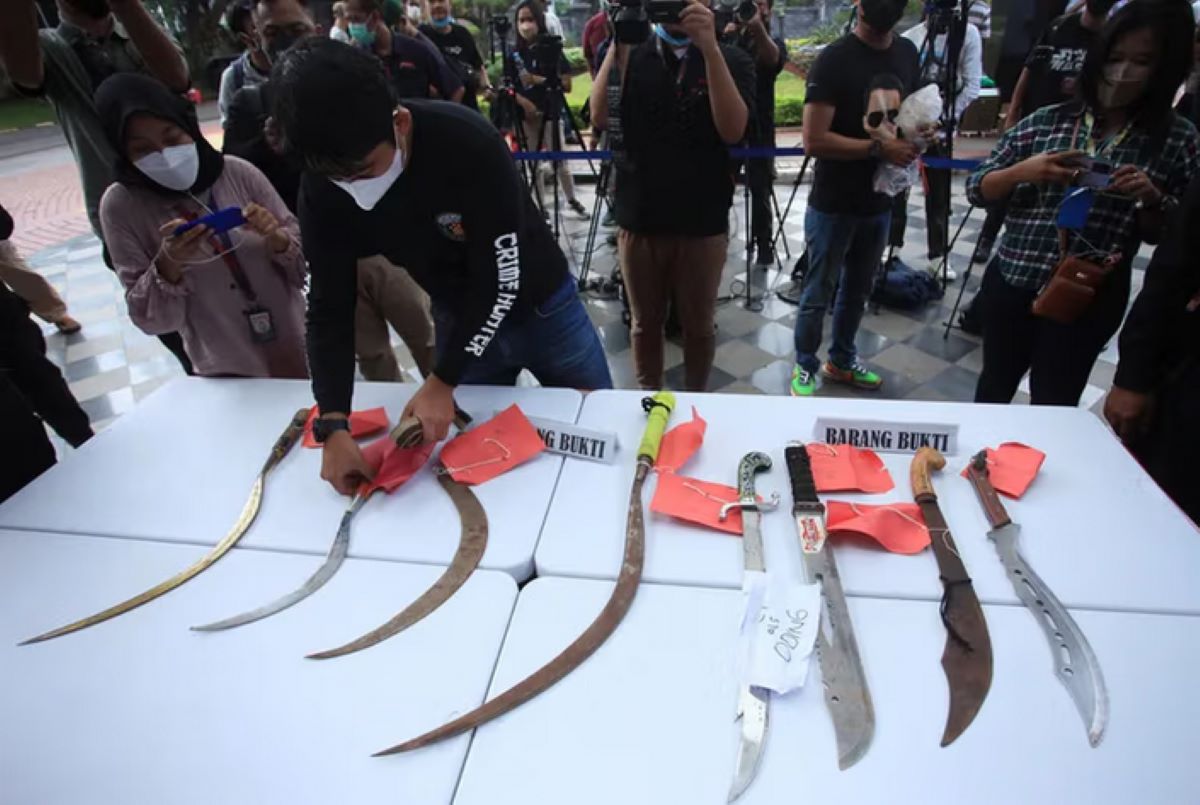 Atas perbuatannya, para pelaku dijerat dengan Pasal 2 ayat (1) Undang-Undang Darurat Nomor 12 Tahun 1951, terkait kepemilikan senjata tajam tanpa izin, dengan ancaman hukuman maksimal 10 tahun penjara. (Fik/P-2)