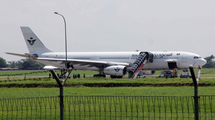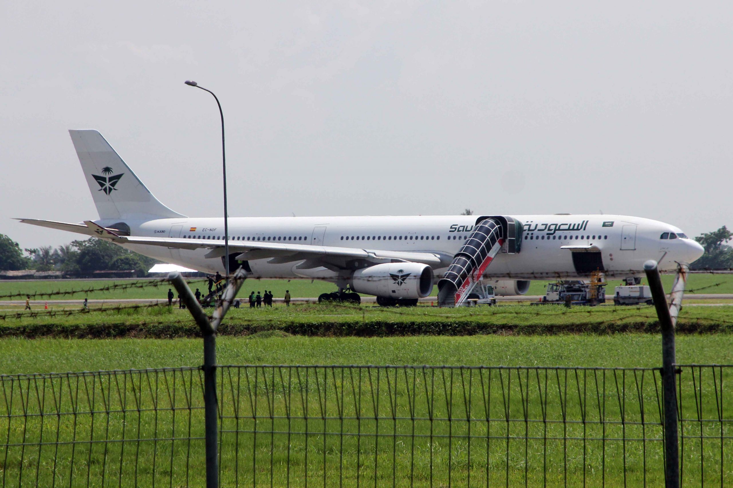 Petugas menggunakan kendaraan membawa koper jamaah haji dari pesawat Saudia Airlines nomor penerbangan SV-5688 di landasan usai mendarat darurat di Bandara Dunia Kualanamu, Kabupaten Deli Serdang, Sumatera Utara, Sabtu (21/6/2025). Pesawat Saudia yang berangkat dari Jeddah tujuan Surabaya dengan membawa sebanyak 376 jamaah haji mendarat darurat di Bandara Dunia Kualanmu akibat adanya dugaan teror bom. ANTARA FOTO/Yudi Manar/Ppj