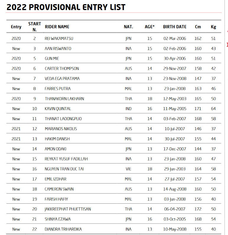 Tahun ini grid diisi Pembalap Muda yang merupakan Perwakilan tujuh negara Australia, India, Indonesia, Jepang, Malaysia, Thailand dan Vietnam. Dan Niscaya akan Terdapat Pemenang baru dan nama baru di tangga teratas pada akhir Musim nanti.