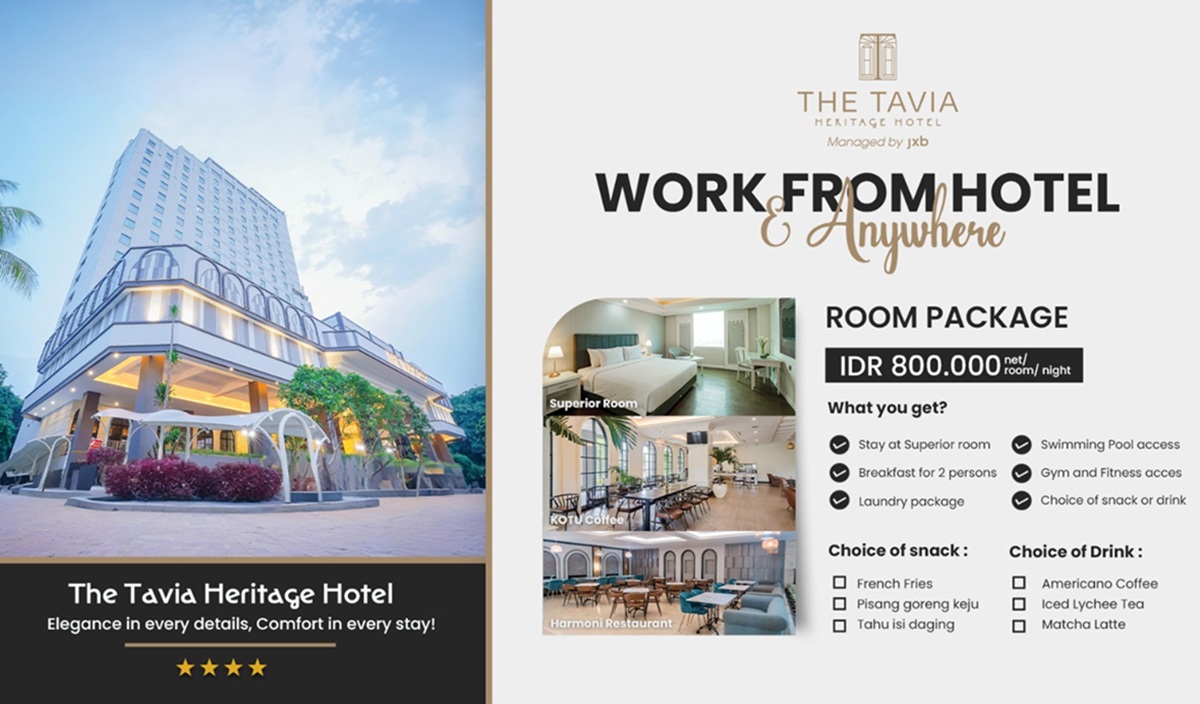 MENJAWAB kebutuhan akan fleksibilitas bekerja sekaligus berlibur, The Tavia Heritage Hotel menghadirkan promo menarik Kepada para tamu: Work From Anywhere Package dan tambahan diskon 25% Spesifik Kepada pemesanan melalui website Formal hotel.