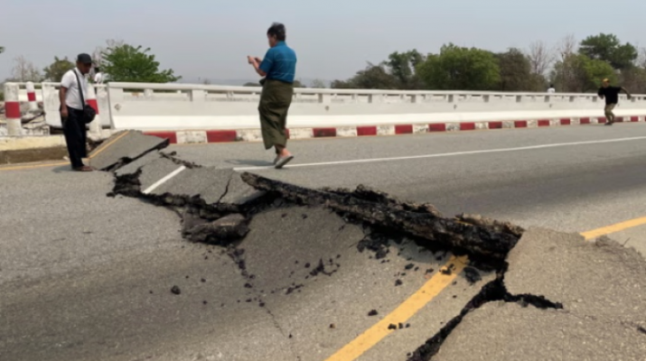 Jalan yang rusak akibat gempa 7,7 magnitudo yang mengguncang Myanmar. Foto: EPA