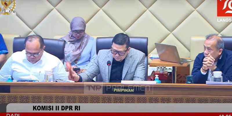 Rapat dipimpin oleh Ketua Komisi II DPR RI Ahmad Doli Kurnia. Tampak hadir Ketua KPU RI Mochammad Afifuddin dan anggota KPU lainnya.
