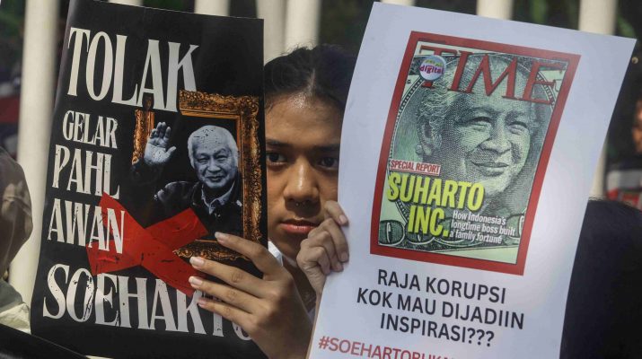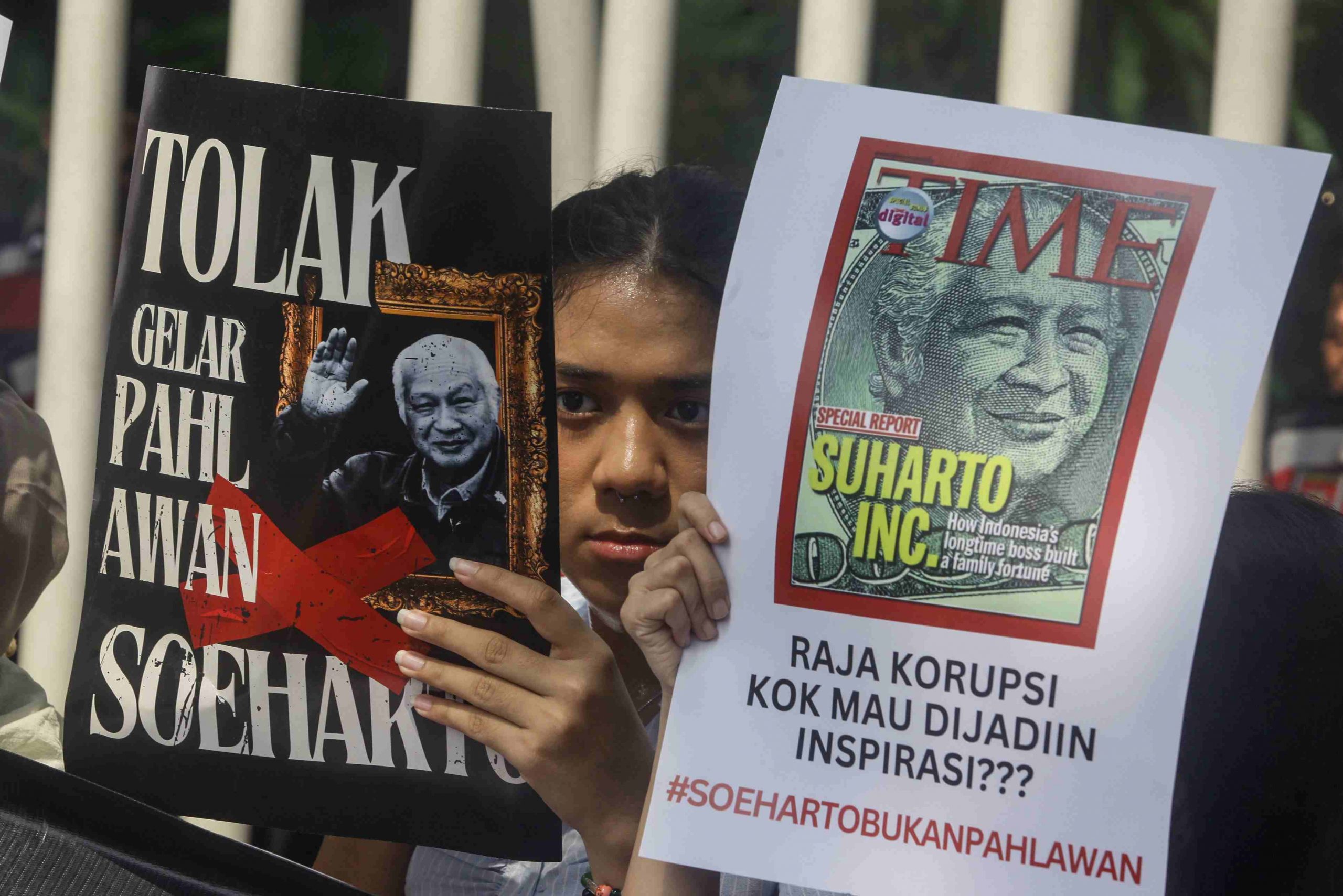 Koalisi Gerakan Masyarakat Sipil Adili Soeharto (Gemas) berunjuk rada di depan kantor Kementerian Sosial (Kemensos), Jakarta Pusat, Kamis, (15/5/2025). Mereka mendesak pemerintah membatalkan rencana pemberian gelar pahlawan nasional kepada mantan presiden Soeharto. Sebelumnya, Kemensos menerima sepuluh nama baru yang diusulkan Kepada mendapat gelar pahlawan termasuk Soeharto. MI/Usman Iskandar/Ppj