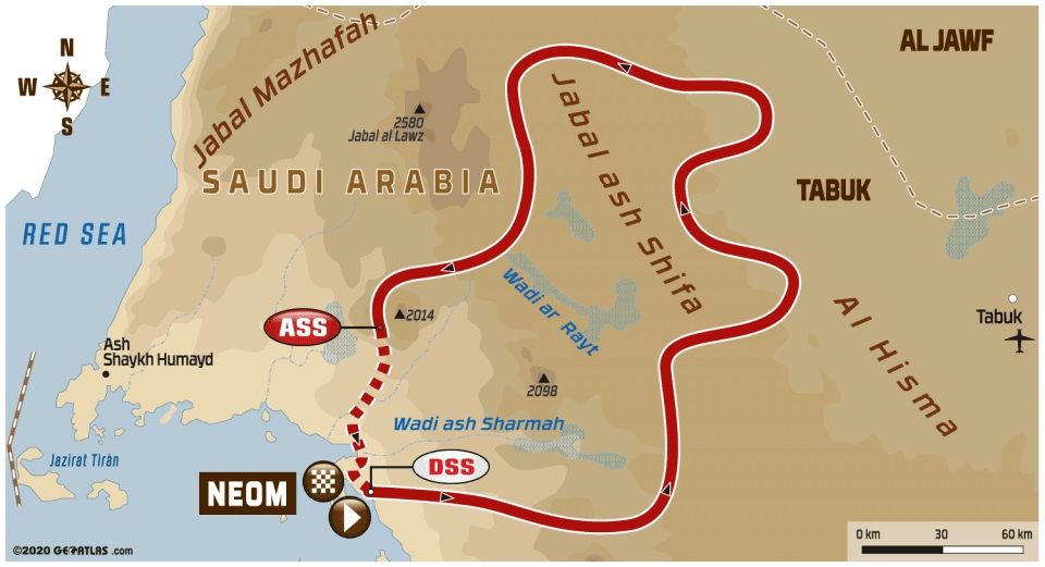 Menandai Paruh kedua dari Stage Super-marathon – Stage Ketiga dari rally Dakar 2020 ini terbukti lumayan berat Buat Sekalian peserta. Total rencana Jalur yang harus ditempuh adalah 504 km berbentuk Loop termasuk 427 km Km Sesi Special masuk lembah naik ke pegunungan Jabal As-Shifa dibagian Utara dari Saudi arabia