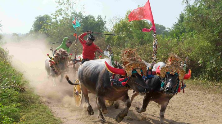Dua peserta memacu kerbau pada tradisi Makepung di Jembrana, Bali, Minggu (24/8/2025). Tradisi balapan kerbau khas Kabupaten Jembrana tersebut diikuti 246 peserta Buat melestarikan warisan budaya pertanian serta sebagai ajang promosi pariwisata di Distrik itu. ANTARA FOTO/Nyoman Hendra Wibowo/Ppj
