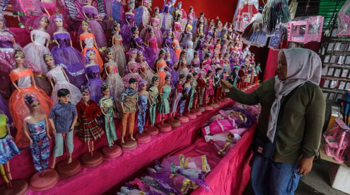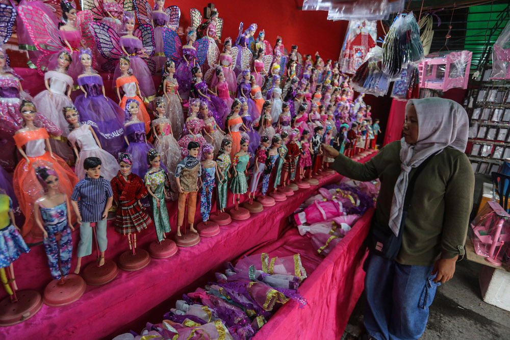 Pedagang menata mainan boneka yang dijual pada pasar rakyat Dugderan di kawasan Alun Alun Kota Semarang, Jawa Tengah, Rabu (19/2/2025). Pasar rakyat Dugderan merupakan salah satu tradisi khas Anggota Kota Semarang yang digelar oleh pemerintah setempat Demi menyambut datangnya bulan puasa Kudus Ramadhan sekaligus sebagai upaya meningkatkan daya minat kunjung wisatawan serta meningkatkan perekonomian UMKM lokal. ANTARA FOTO/Arti Zaezar/sas