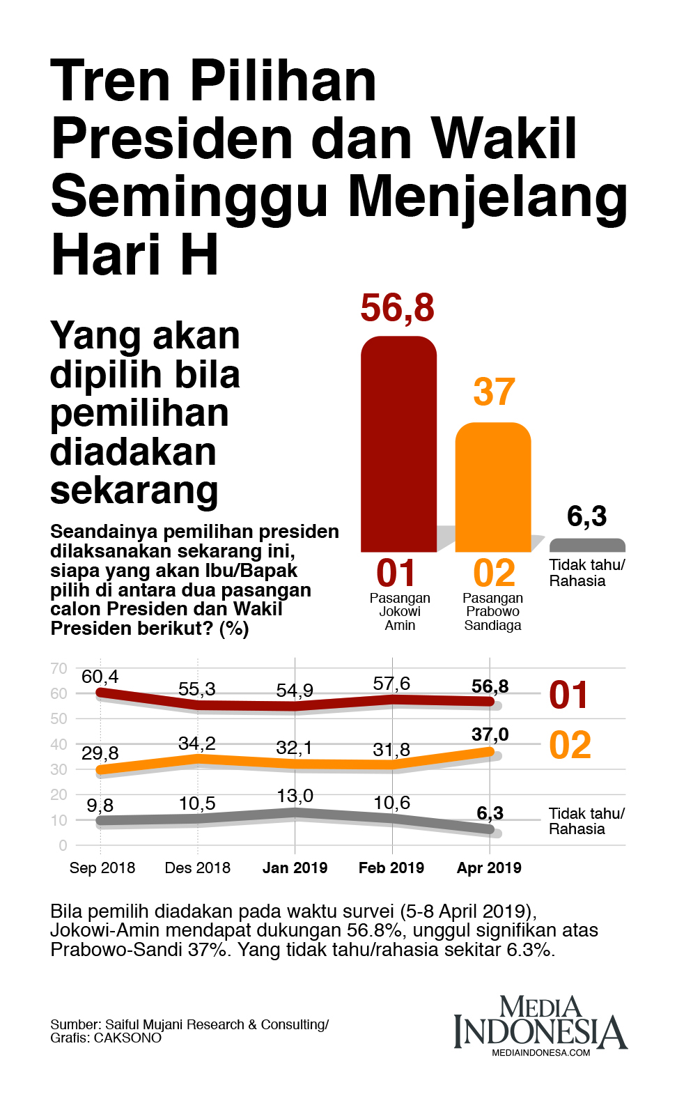 Bila pemilih diadakan pada waktu survei (5-8 April), Jokowi-Amin mendapat dukungan 56,8%. Unggul signifikan atas Prabowo-Sandi 37%. Yang Bukan Mengerti/rahasia Sekeliling 6,3%.