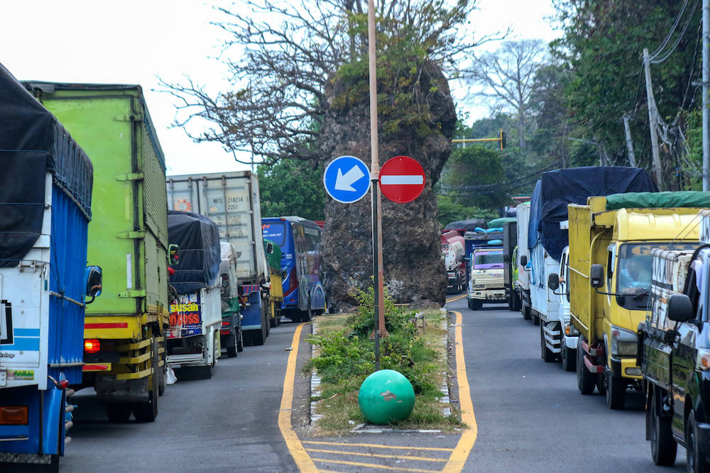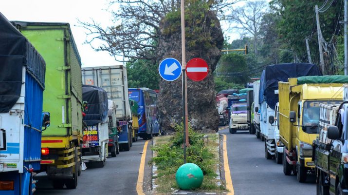 Sejumlah kendaraan terjebak kemacetan di jalur Pantura Watudodol, Banyuwangi, Jawa Timur, Kamis (24/7/2025).Berdasarkan pantauan PT ASDP Indonesia Ferry, antrean kendaraan—yang didominasi truk barang—menuju Pelabuhan Ketapang, Banyuwangi, mencapai 26 kilometer. Kemacetan ini terjadi akibat Restriksi operasional kapal lintas Ketapang–Gilimanuk oleh KSOP sebagai bagian dari upaya peningkatan aspek keselamatan pelayaran.