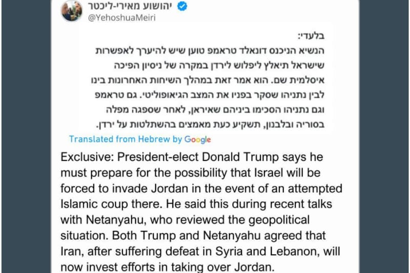 SEORANG jurnalis dan peneliti, yang tinggal di Israel menulis di media sosial, melaporkan bahwa Terdapat kemungkinan Israel melakukan invasi ke Yordania. Ini dia sampaikan dengan mengutip pernyataan Presiden terpilih AS Donald Trump.